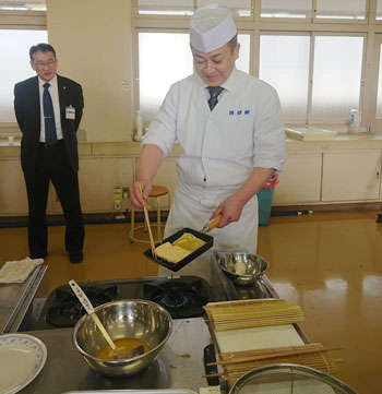 平成31年2月13日(水)東広島市立安芸津中学校(2年生2クラス)で、藤田寛治監事(『海の味処 藤田屋』店主)が出前講座を行いました。テーマは『日本の食文化のよさを理解する』。和食とは、出汁とはの話をし、実際に出汁をとり出汁巻玉子を作って、生徒達に食べてもらいました。生徒達は、旨味を理解でき感動していました。