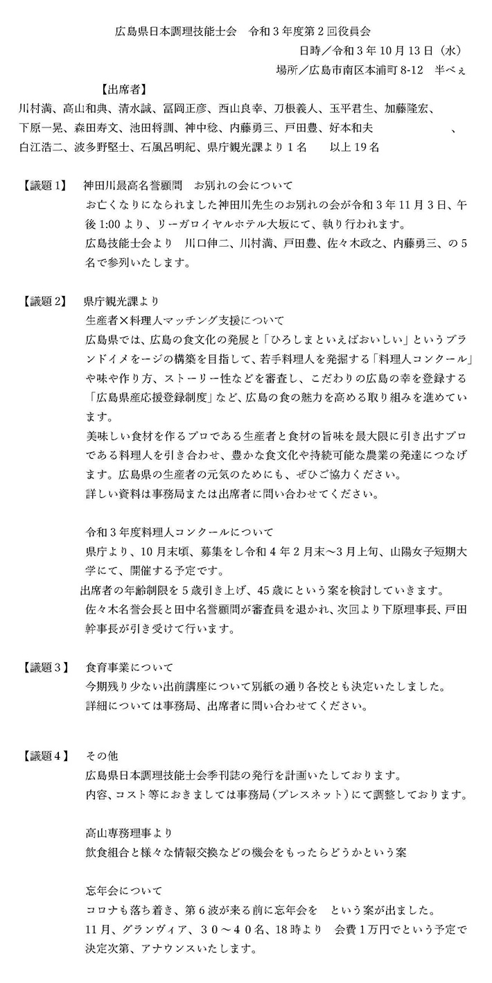 令和3年10月13日(水)15:00〜、広島市南区本浦町の半べえにて、広島県日本調理技能士会令和3年度2回目役員会が執り行われました。